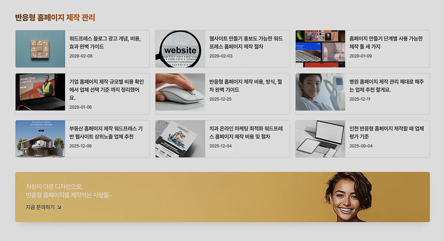 여러분이 생각했던 예산과 업체 견적에 차이가 많았다면 워드프레스 기반 웹사이트를 고려해 보세요. 기능적인 면에서도 만족스러운 결과를 기대할 수 있으니까요. 이 글에서 워드프레스 홈페이지 제작 비용 관련해 상세 정보를 확인할 수 있으니 참고해 보시기 바랍니다.